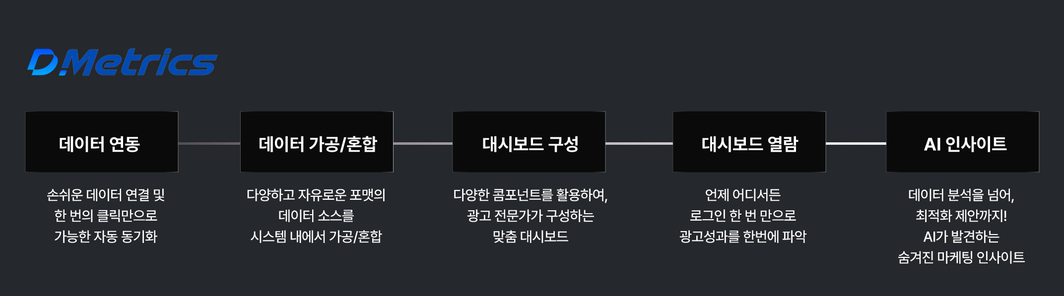 다양한 플랫폼에서 발생하는 광고데이터를 하나로 통합하고, AI가 분석한 최적의 인사이트를 클라이언트에게 제공하는 디엠씨미디어 내부용 광고성과 분석 플랫폼입니다.