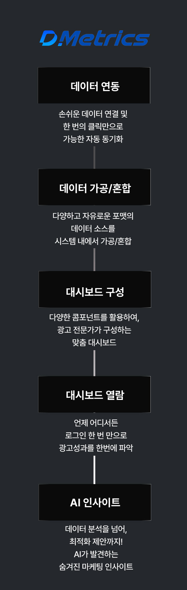디지털 마케팅 시대, 수많은 플랫폼에서 발생하는 광고데이터를 손쉽게 통합하고 AI가 분석한 인사이트를 활용해 클라이언트가 최적의 마케팅 의사결정을 할 수 있도록 돕는 광고성과 분석 플랫폼입니다.